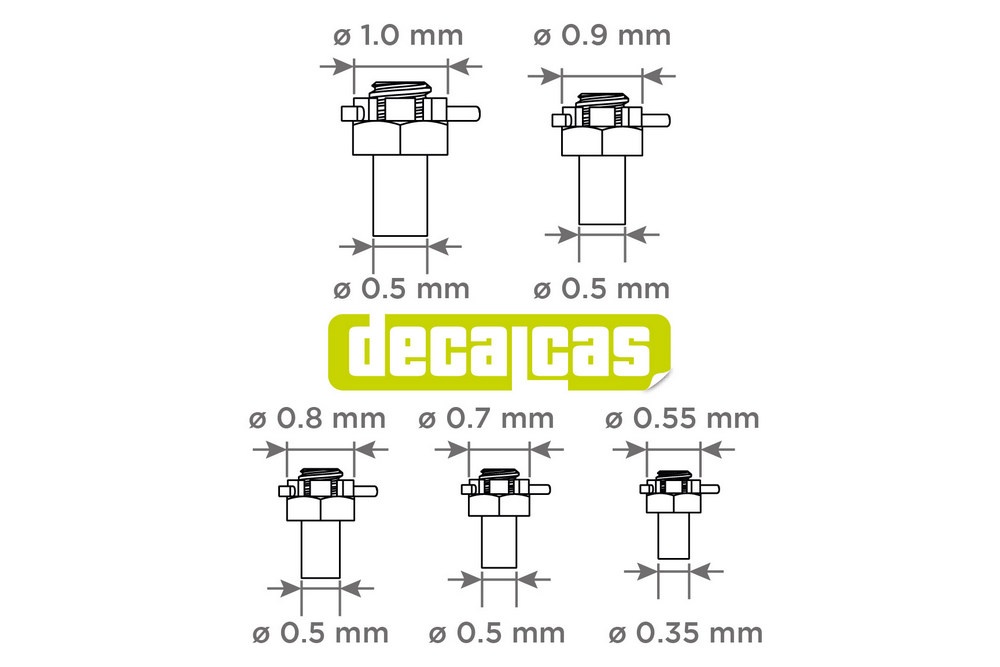 Set of 500 castle nuts with built-in pin in the following sizes: 0.55mm, 0.7mm, 0.8mm, 0.9mm and 1.0mm (100 units of each of the different sizes). With them you can detail any part of your vehicles where this type of nut is found.
