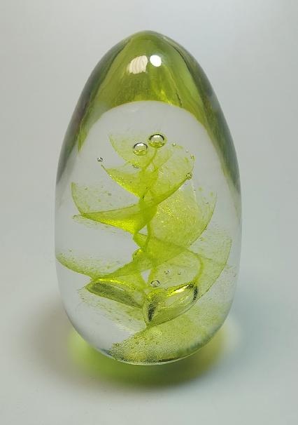 Skleněné těžítko ve tvaru vejce, uvnitř podjímané oranžovým sklem tvořícím spirálu.