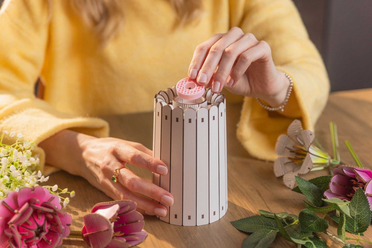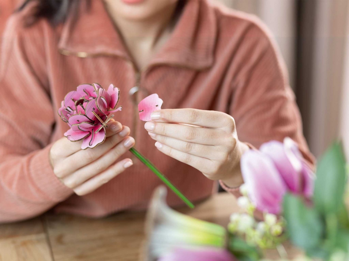 Dřevěná květina ke složení. Velikost: 27 cm.Balení obsahuje 181 dílků.