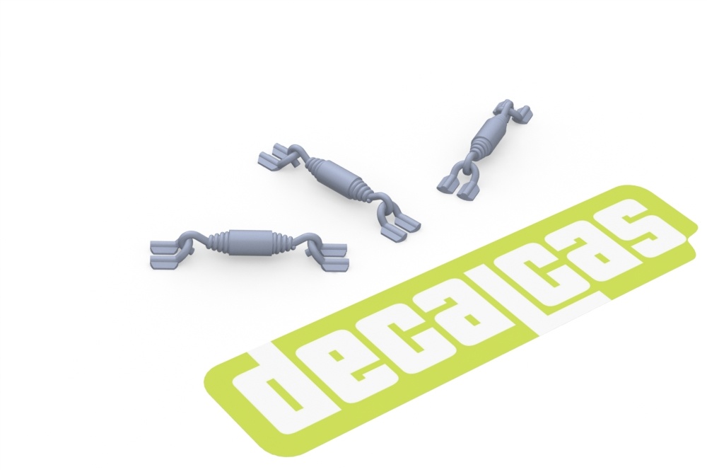 Short springs with shock absorber reproduced at 1/12 scale, similar to those used in competition for mounting and adjusting mufflers and exhaust pipe components. Made in resin by 3D printing, they reproduce all the details, such as the conical finish of the spring, the rubber that protects it, and the „U“ anchors that are welded on the exhausts, so that you only have to paint and glue them on your scale kit.
